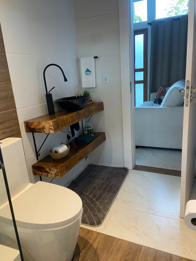 O banheiro é moderno e funcional, garantindo o conforto durante toda a estadia.
