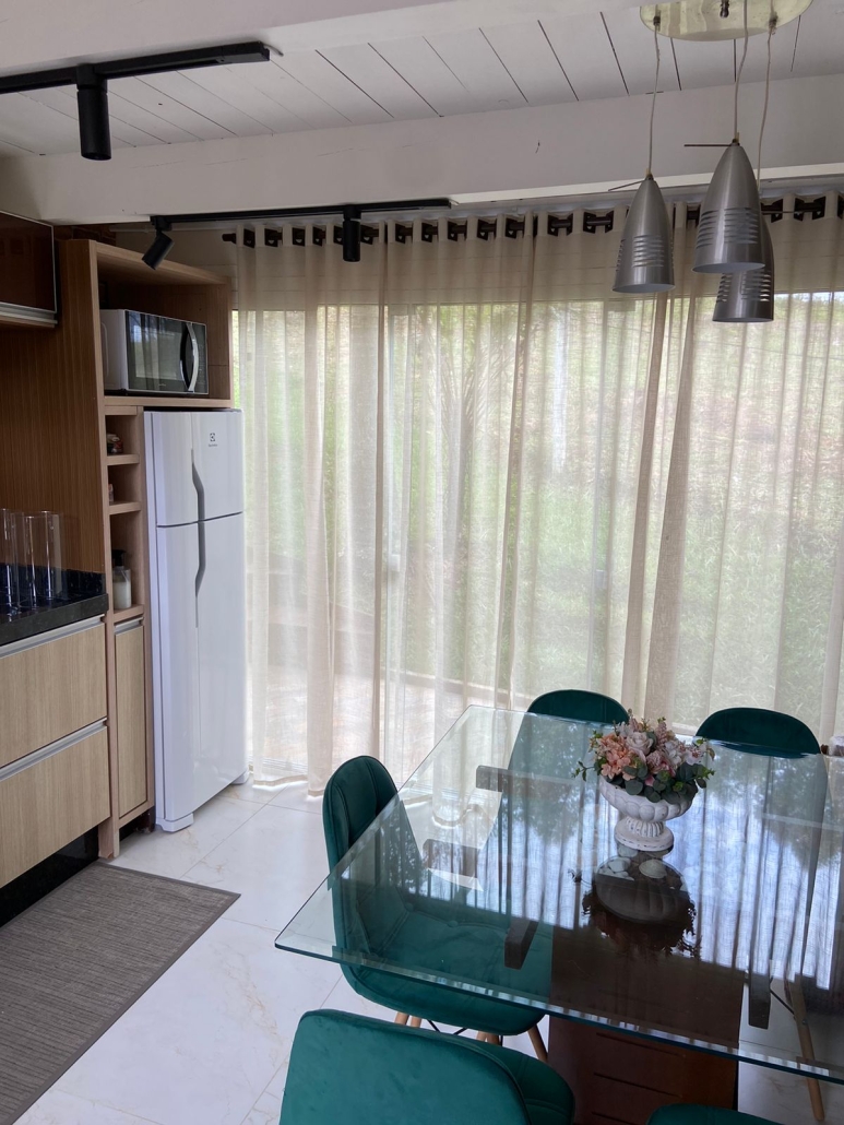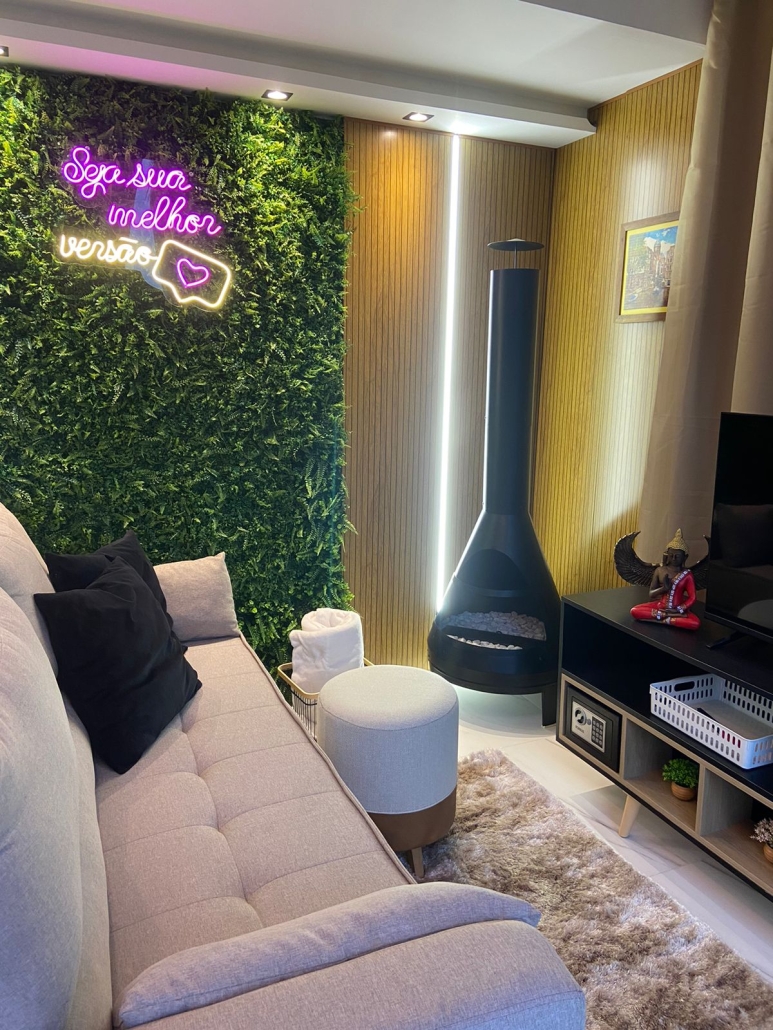 A sala de estar é ampla, aconchegante e conta com uma lareira, ideal para curtir momentos especiais a dois ou em família nas noites frias.
