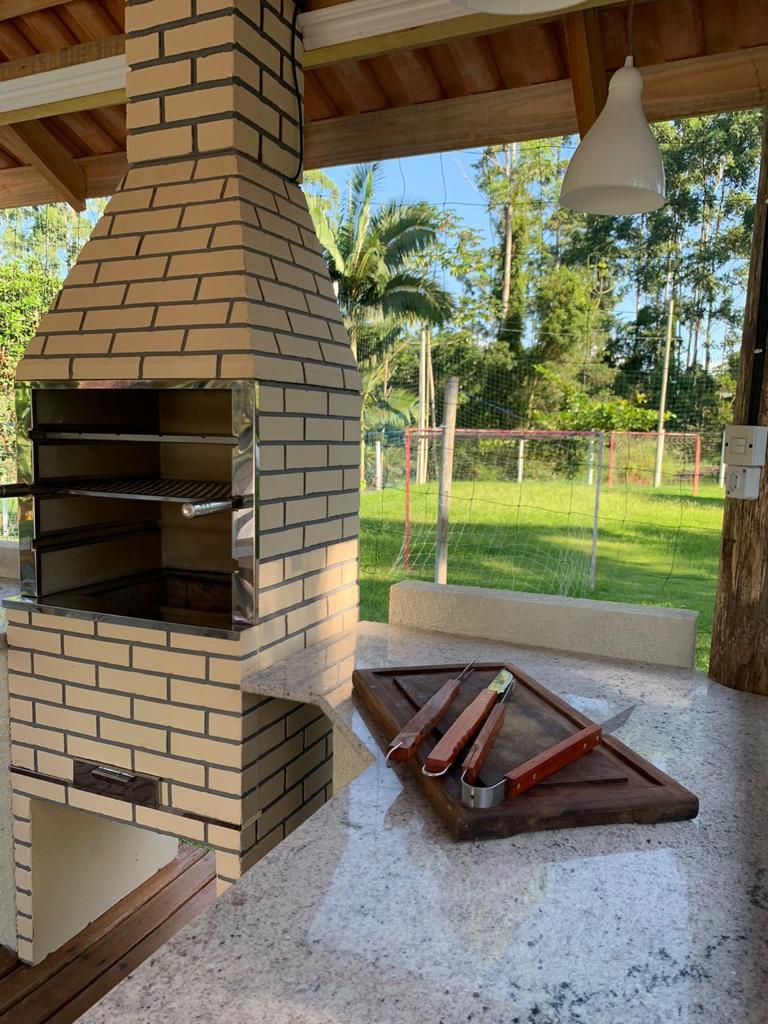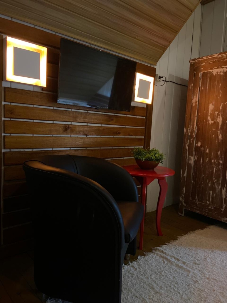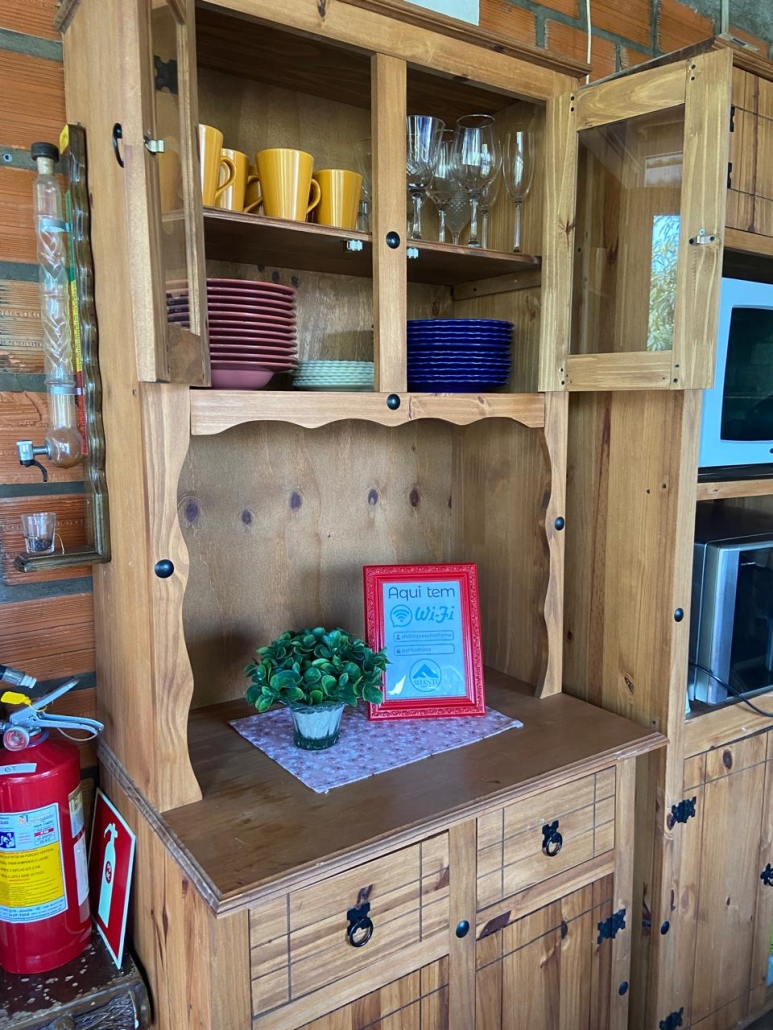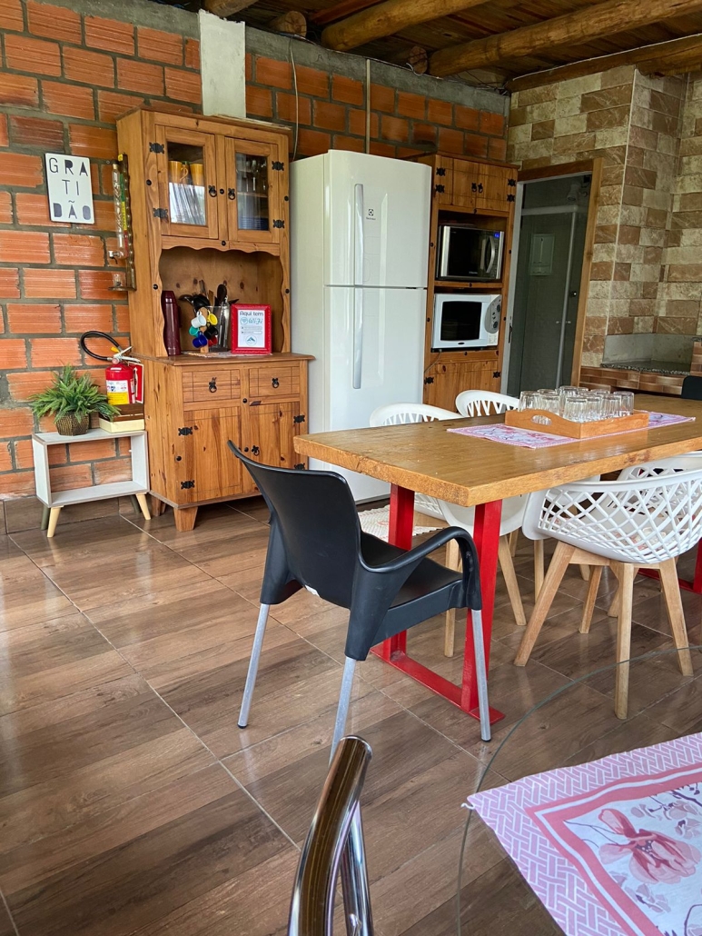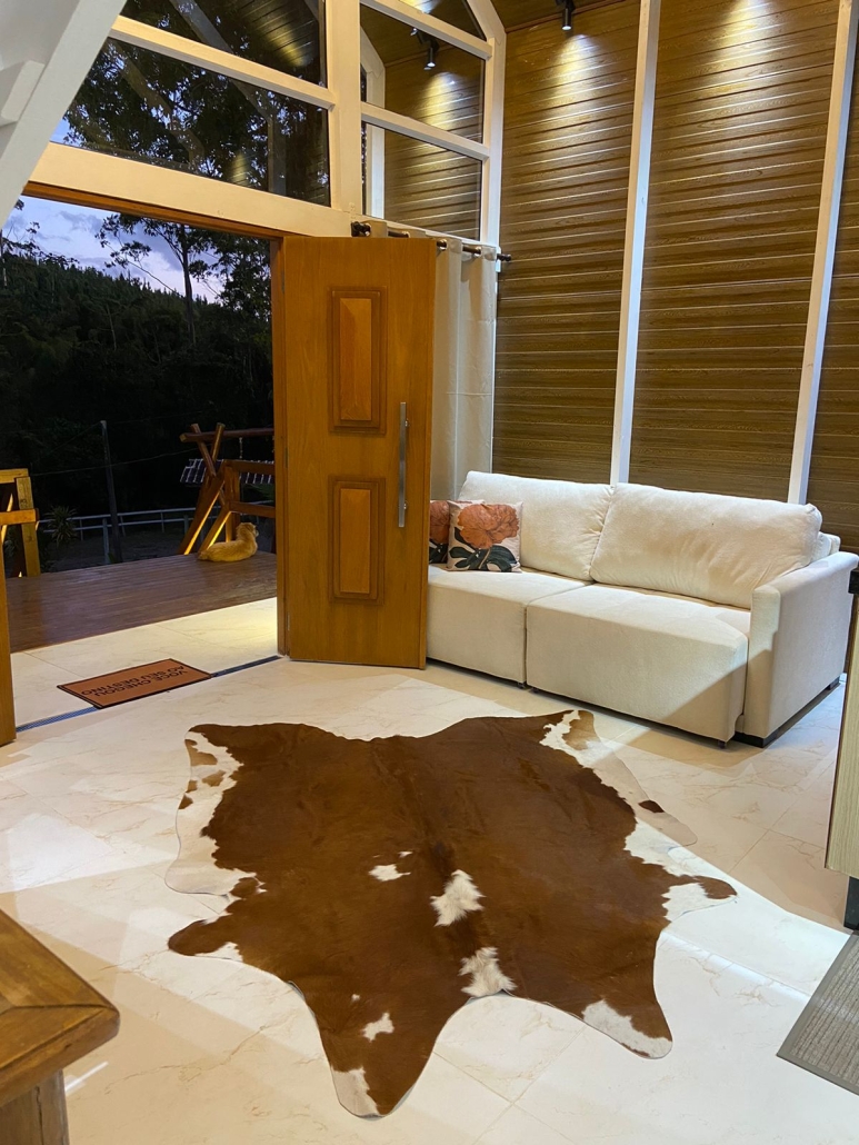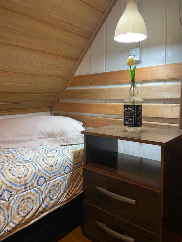 O chalé conta com sala completa, perfeita para momentos de lazer, e inclui lareira, criando um ambiente acolhedor e aconchegante. O banheiro é funcional e bem estruturado, garantindo praticidade durante a estadia.