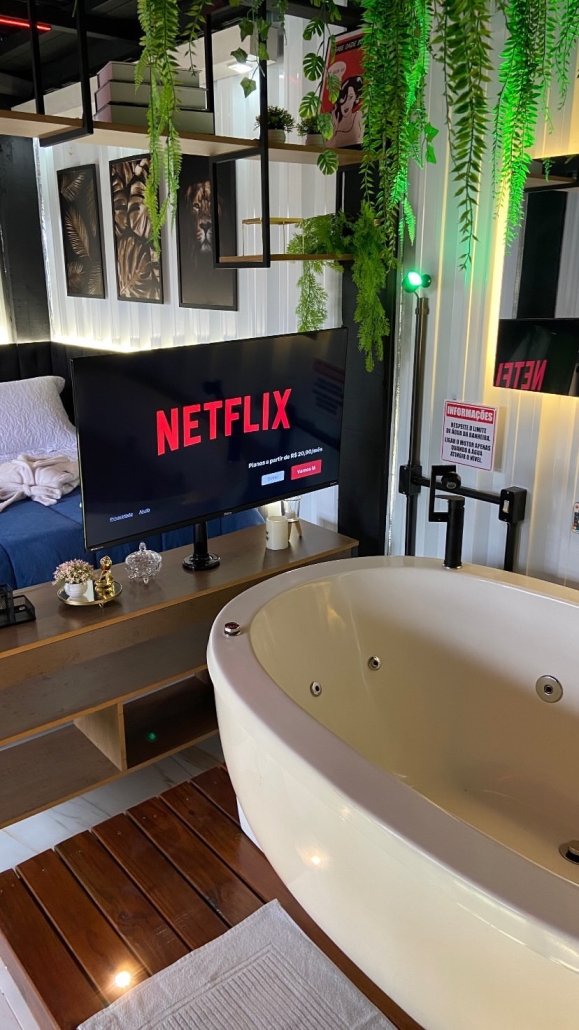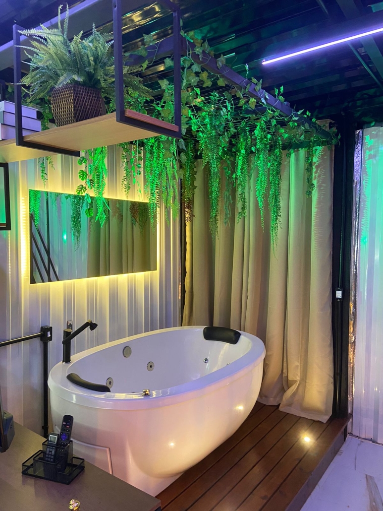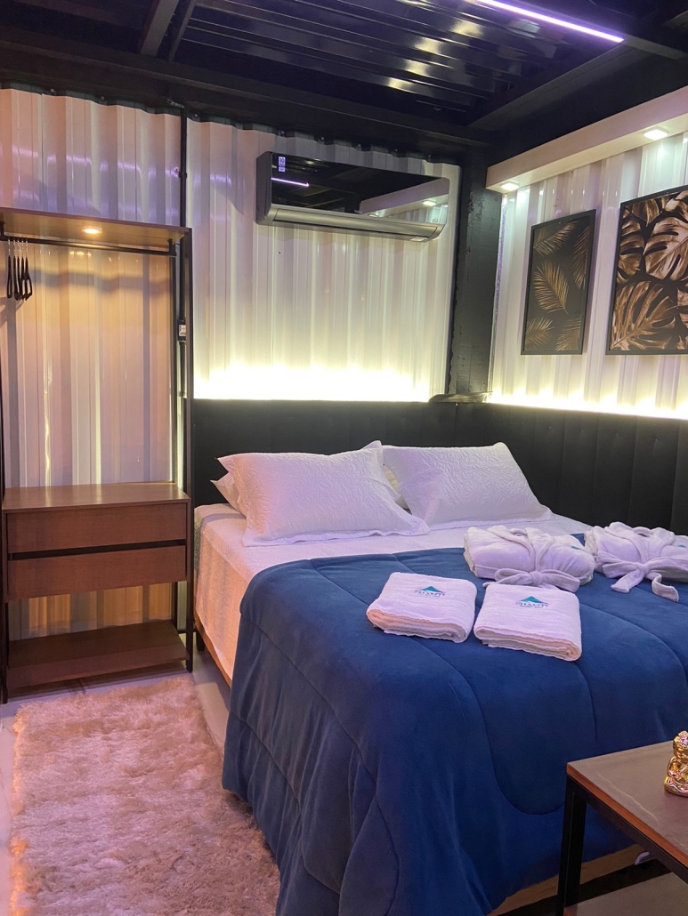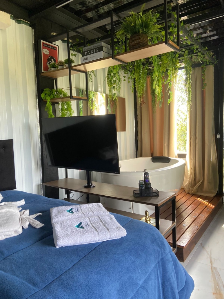 No quarto, o destaque é a banheira de hidromassagem, pensada para proporcionar relaxamento total e momentos inesquecíveis.