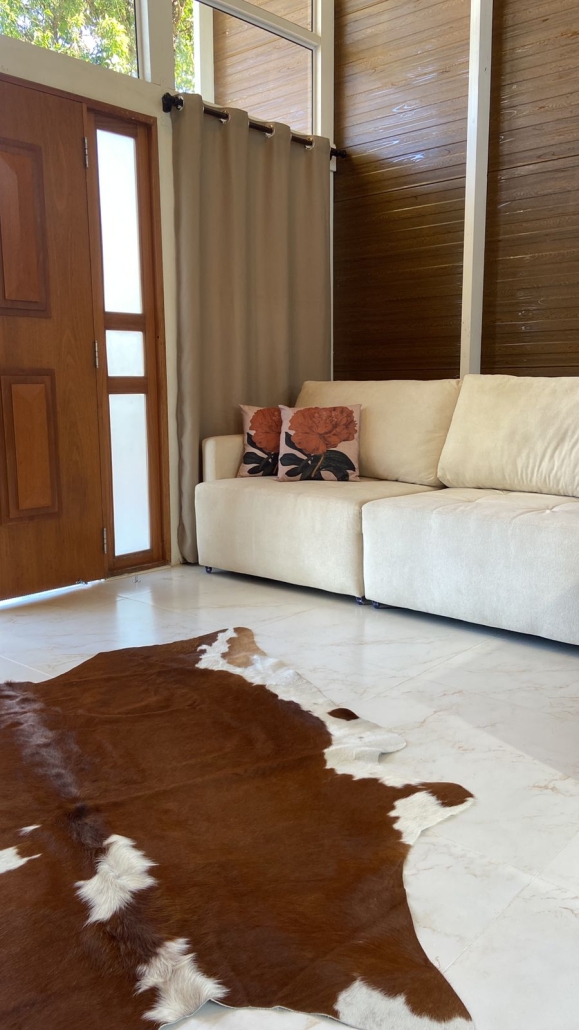 A sala completa proporciona momentos de convivência e lazer, enquanto a lareira aquece os dias mais frios, criando um ambiente acolhedor e intimista. O chalé também conta com banheiro funcional, pensado para sua praticidade e conforto.